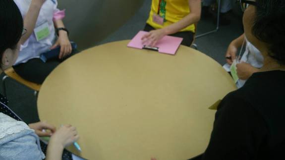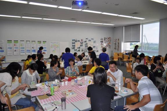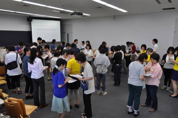 そしてさらに午後は、午前のテーマを受ける形で「学校図書館のディレンマ:対話の力」と題したワークショップの基礎と実践を行いました。これもまた、ただ漫然とワークショップを行うというものではありません。専門家である小峰先生の指導のもと、基礎的な理念を習って即実践するという、実にぜいたくで刺激的なワークショップでした。討議のために設定された事例は二つとも学校図書館ではよくある、深刻でいくつもの問題を抱えたもので、全体をまじえた話し合いではかなり熱くなりました。しかしその場が、常に温かく安心できるものであったことも間違いありません。これはひとえに、講師でありファシリテーターでもある小峰先生の手腕とお人柄のおかげであったと思います。そして小道具としてご用意いただいた“えんたくん”の魅力的であったこと!私たちは、なんと幸運な時間をもてたことでしょうか。1日目の夜は恒例の懇親会も行われ、さらに親交や話し合いが深まったことは間違いありません。