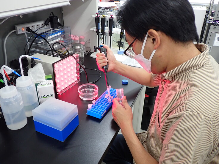 温度や光の強さを変化させたり、光合成で生じる有害物質を除去できる化学物質を添加したり、ウミウシの遺伝子の働きを抑える環境に置いたりするなど、さまざまな刺激を与え、その状態での光合成やウミウシの元気度合いの変化を「ウミウシ聴診器」で調べます。