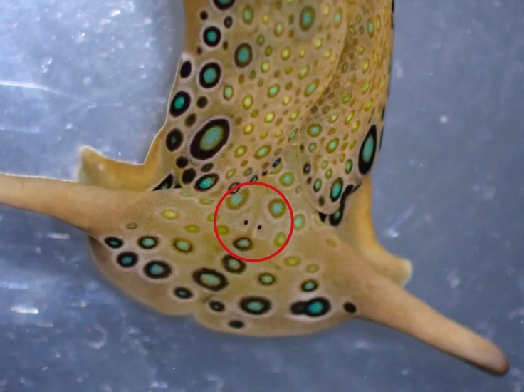 一般的にウミウシには2対(4本)の触角がありますが、チドリミドリガイは1対(2本)の触角があります。