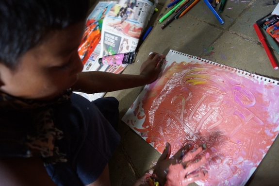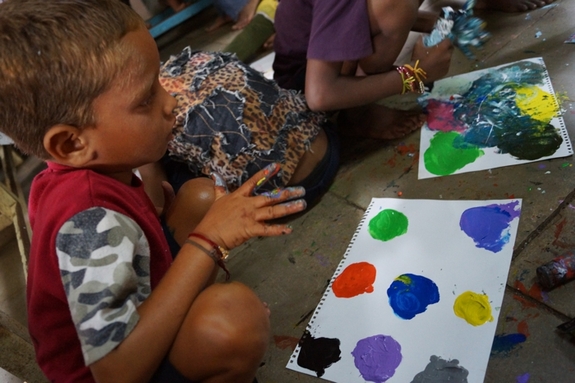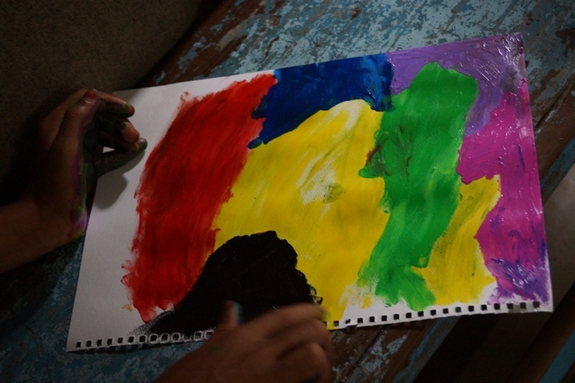 どんどん自分で絵の具を見つけては迷いなく手で色を塗っていきます。