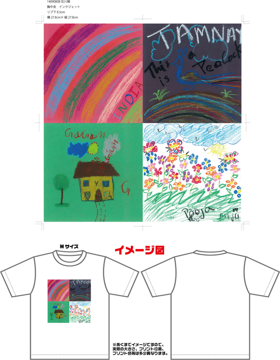 当初単独の絵でのデザインを考えていましたが、「地球へのラブレターTシャツ会議」にて4枚組合せのデザインとすることに決定しました。
