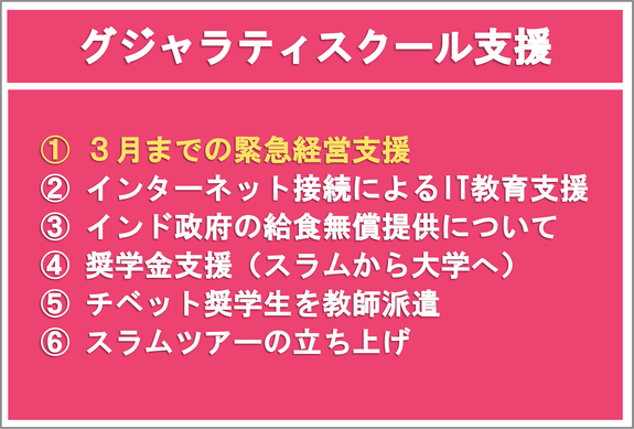 これは、昨年10月にインドにおいてグジャラティスクール経営陣(ジョセフィン先生、ネルー先生、ステファンCEO)と協議決定した事項のうち、① 3月までの緊急経営支援の第2期分(1-3月期、前回10-12月期は済)となります。