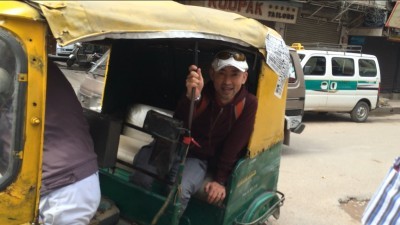 石川さんと私は、子供たちへ届ける荷物を積んでオートリキシャーで。