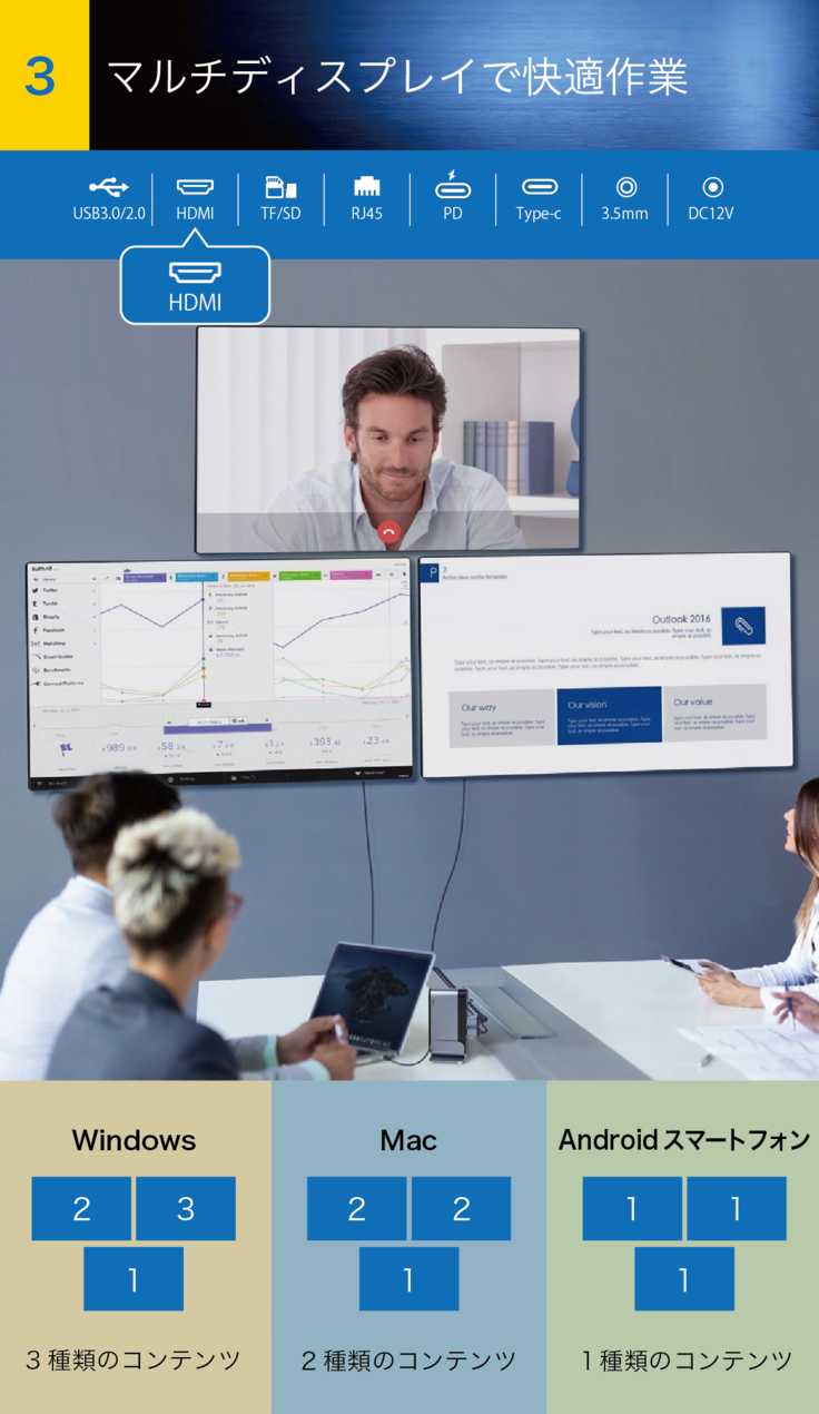 最大で3台のHDMI対応ディスプレイを接続すれば、3画面に別々の情報を出したり、同じ内容を複数の画面に表示するなど状況や用途に応じた使い分けが可能です。
