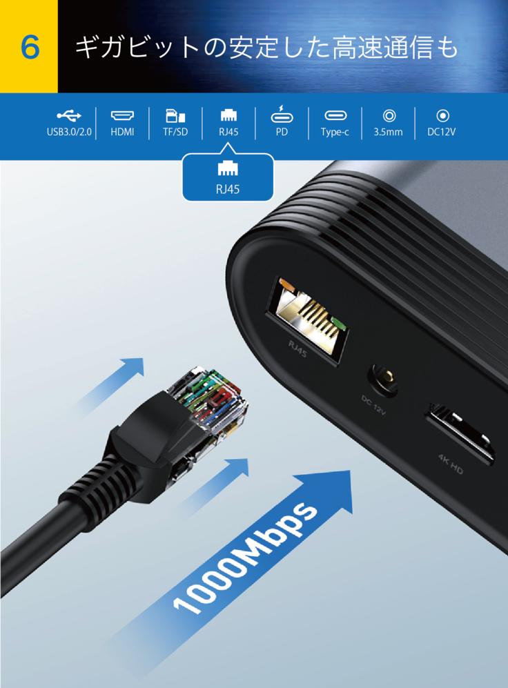 Wi-Fiがない場合やWi-Fi信号が弱い場合はもちろん、より安定したネットワーク環境を使うために有線接続に切り替えることがよくあります。そんな時にノートパソコン本体に接続するのではなく【スマート・ステーション】を有線接続しておけば、Type-Cケーブル1本で、最大1000Mbpsまで対応の安定したネットワーク速度で作業ができます。