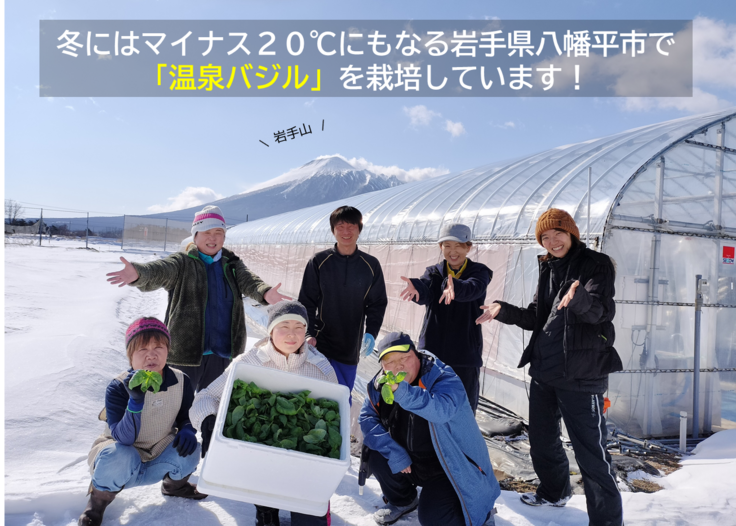 はじめまして。私たち八幡平スマートファームは、雪深い岩手県八幡平市で、商用稼働している松川地熱発電所から流れ出る温泉を活用した熱水ハウスで、IoT技術を使い、通年で「温泉バジル」を栽培しております。