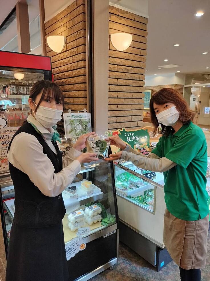 今日はスタッフと杜仲茶ポークの写真♪大更の肉の横沢様のブランド豚肉「杜仲茶ポーク」と八幡平スマートファームの温泉バジルのコラボ商品!!どちらも隠し味にトマトを加えてイタリア風味に仕立ててあります!こんな商品も実は売っているのです♪ここは八幡平ハイツ様です♪