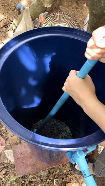 3、大きい石を浄水器本体に入れ、濾過しやすいように平らにする