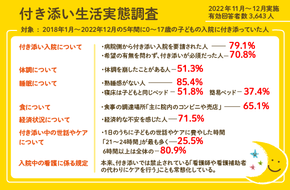 私たちが2023年6月に公表した「入院中の子どもに付き添う家族の生活実態調査2022」では、これらの実態がデータとしても明らかになりました。