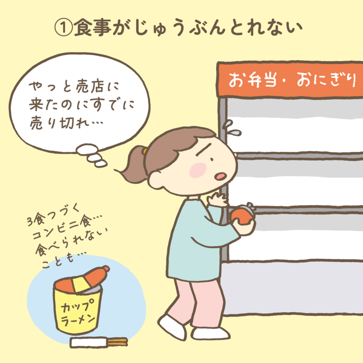 毎食、院内の売店で買うコンビニ食で済ませ、それも子どもの検査や治療の都合で食べそびれることも日常茶飯事です。