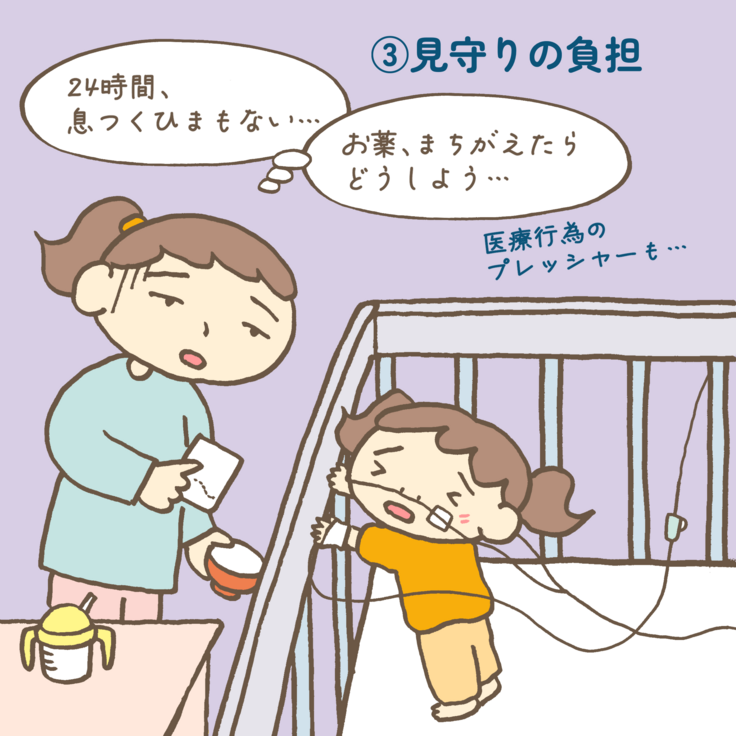 小児病棟で子どもの身の回りの世話を担う家族、その大半は母親ですが、お母さんたちの日常は過酷です。子どもの不安定な容体と慣れないケアに24時間心が張り詰める中、まともな食事を食べることもできません。