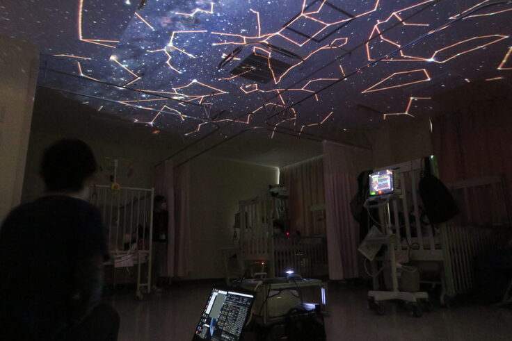 子どもとご家族が一緒に中に入って楽しむドーム型に加えて、ベッドから離れられない子どもたちには、窓に黒いシートを張って天井にプラネタリウムを投影しました。