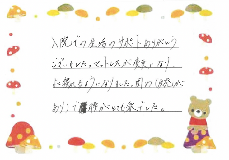 「マットレスが変更になり、よく眠れるようになりました。固め(反発があり)で、腰がとても楽でした。」