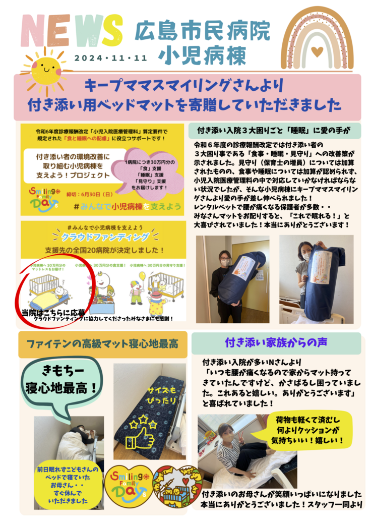 【お届けも佳境!】付き添い家族の3大困りごと「睡眠」を支えるマットレスを6病院にお届けしました