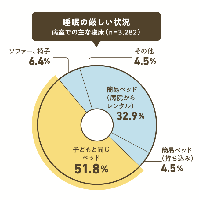 また、子どもと同じベッドで眠るご家族が半数を超え、その他のご家族もほとんどが簡易ベッドやソファーなどで眠る日々を送っていることが分かりました。