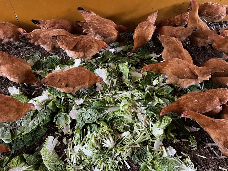 卵を作るためにはカロリーのある穀物をとることが重要です。しかしながら、野菜や草などの緑餌を与えることは、鶏たちの健康を維持するためにもっと大事なことだと考えています。