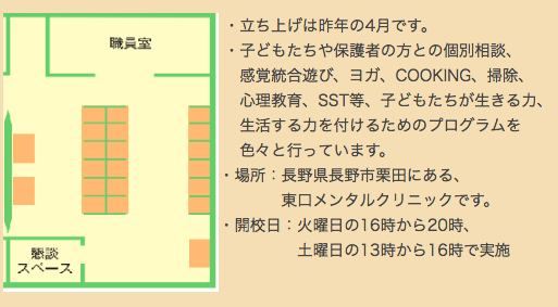 また、SNECでは東口メンタルクリニックで思春期メンタルサポートをしているスタッフ(清水)が、医療者としての目でもしっかりと対応することが出来ます。また、本人が集団療法(デイケア)を望めば、同スタッフが行っているデイケアへの参加も可能です。新たの人間関係の構築が苦手な子であっても、知っている先生が行っている場所であれば、比較的安心感を持って通うことができると考えています。