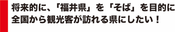 福井ブランドのそばの魅力を発信することで、地元の人たちに在来種そばの魅力を再確認して頂くと共に、北陸新幹線延伸を見据えて全国各地から福井のそば店に訪れてもらうきっかけとしたい。
