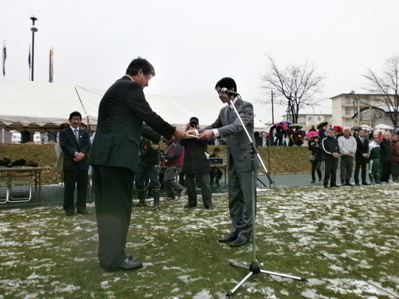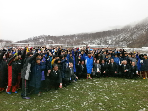 しかし、開会式だけは予定どおり実施、夕張サッカー協会小林会長が披露し、鈴木夕張市長へゴールの寄贈を行いました!選手たちの後方の新品ゴール見えますか?