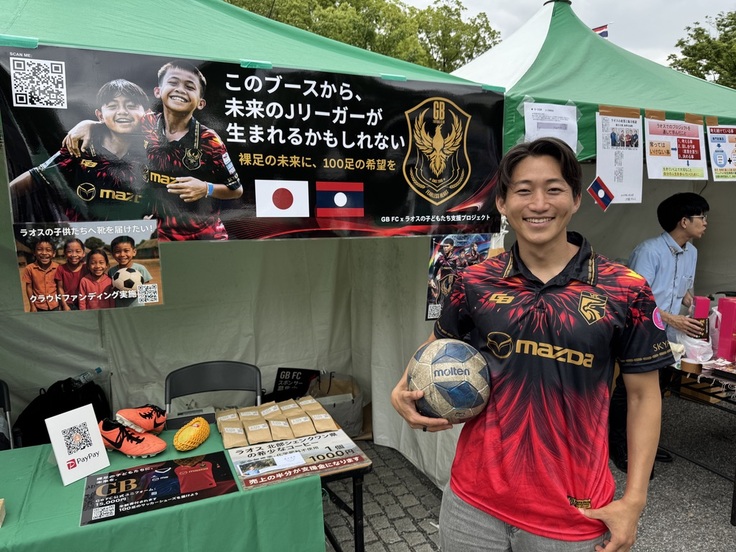 当日は、クラウドファンディングの周知活動を行い、GB FC公式ユニフォームやラオス産コーヒーの販売を通じて支援を呼びかけました。