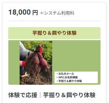 ▶︎体験で応援|芋掘り&餌やり体験をご支援されたい方は、下記の画像をクリックすることで、該当のリターンの支援に移動します。