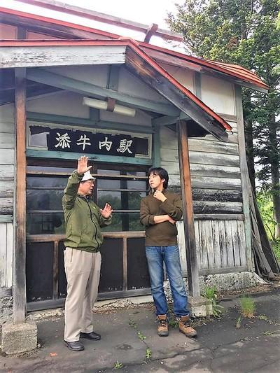 2017年:22年ぶりに復活!「添牛内駅名」手作り看板設置 名寄の志々見さん(右)と銅さん(左)