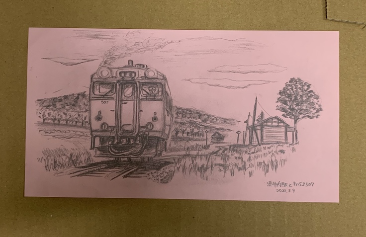 しかも、小暮さんは気分転換にミスプリントのA4のコピー用紙に列車を書いていただけでした。さらにしかも、もともと添牛内駅を書いていたわけではなく、書き始めていたら、車両の向き的に深川方面行き列車じゃないと実物と異なることに気づいて、進行左にホームがある駅を確認したところ添牛内駅が該当したので、書き上げたそうです。