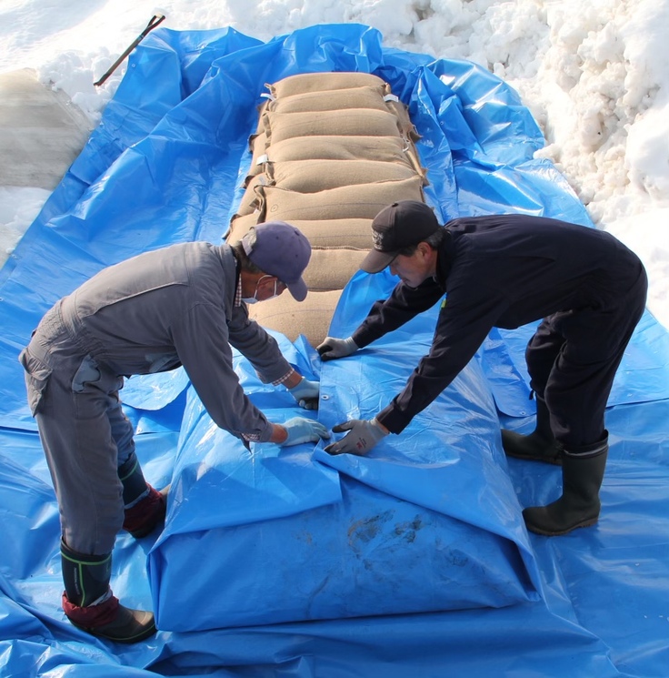 そんな坂本さんが作っている【ねむり雪そば】ですが、敷地内に写真のようにしっかりとブルーシートで包み、豪雪の中に6月まで眠ります。