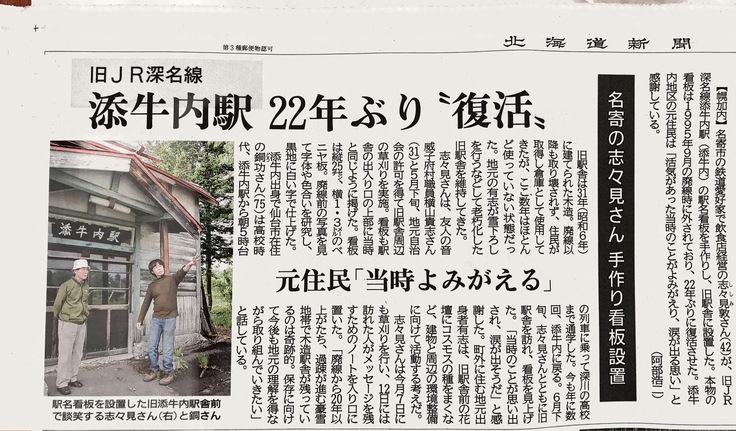平成29年7月13日付「北海道新聞道北版」甦れ!添牛内駅 道新記事: 添牛内web同窓会