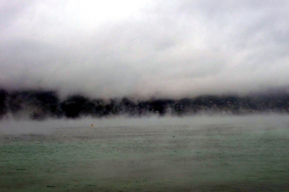 早朝アヌシー湖を散歩していた時に霧が湖面にかかって境界線が消える一歩手前の幻想的な風景です。この後消えました。