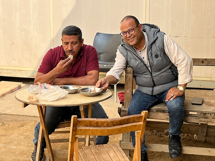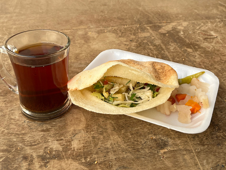 今日は現場の昼食をご紹介します。これはサンドイッチと呼ばれているもので、エジプト風のパンの中にフライドポテトと野菜が入っていて、ピクルスと紅茶でいただきます。たくさんのエジプト人スタッフが、ほとんど毎日、昼食にこれを食べています。