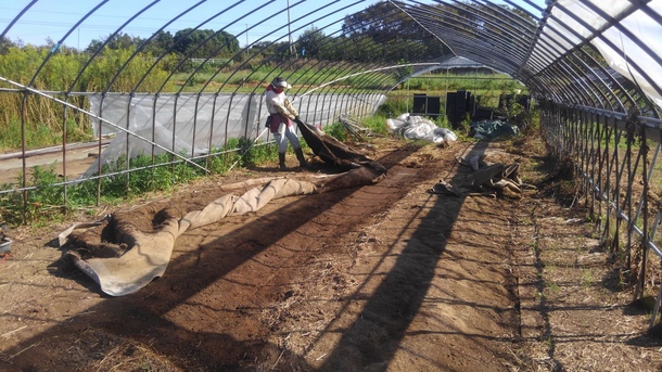 ビニールハウスの改修作業、内部の片付けをしています。
