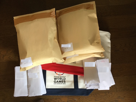 3万年および5万円の引換券購入者へのリターンの一部、「くまモンバッジと世界大会トートバッグ」(3万円のリターンの品であった荒尾梨が不作であるために、了承をいただいて世界大会トートバッグに替えさせてもらいました。)を本日発送しました。