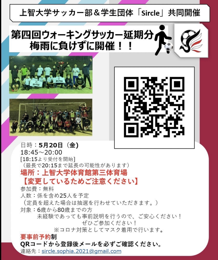 サッカーを通じた社会貢献を目指す上智大学公式団体sircle(シャクル)と連携し、上智大学の学生や教職員、周辺地域の方々をつなぐ「ウォーキングサッカー大会」の第四回を開催いたします。