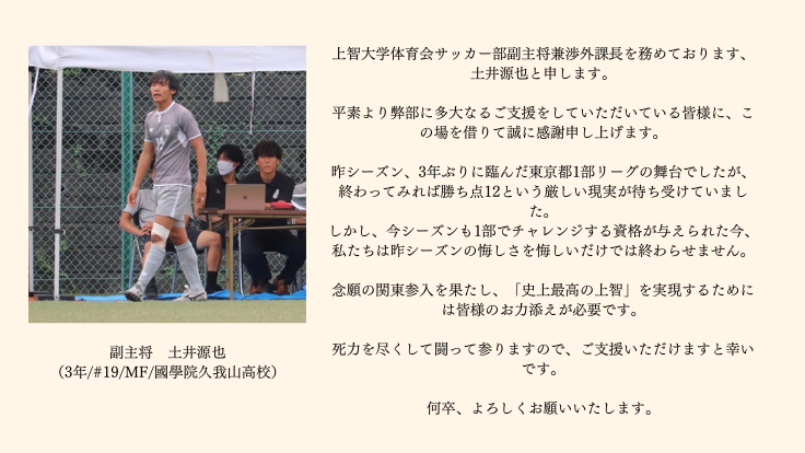 プロジェクトをご覧いただきありがとうございます。上智大学体育会サッカー部です。