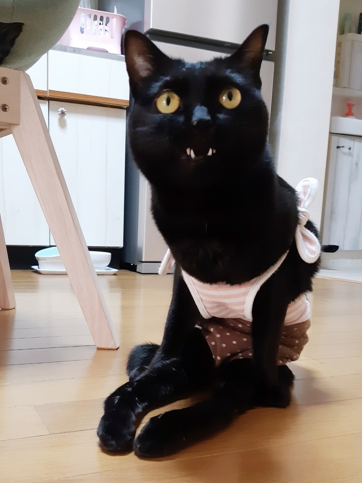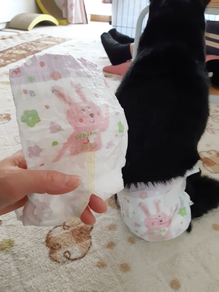 オムツは犬、猫用は高いので新生児用のオムツにしっぽが出る所を切って使っています。