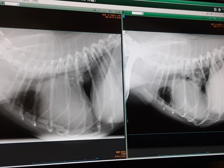 左が手術前で右が土曜日です、上まで肥大していた心臓が小さくなっています。