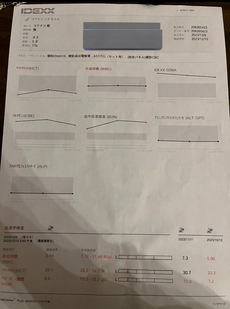 やはり血球数が減り始め、血液濃度も下がってきており、腎性貧血を起こし、再び改善薬の注射をしてもらい、2週間後(12/25)に追い注射して様子を見ることに。