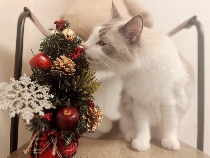 今朝もご飯を食べたあと、部屋中を走り回って、キャットタワーに登ったので、横にクリスマスツリーを置いて写真撮りました。