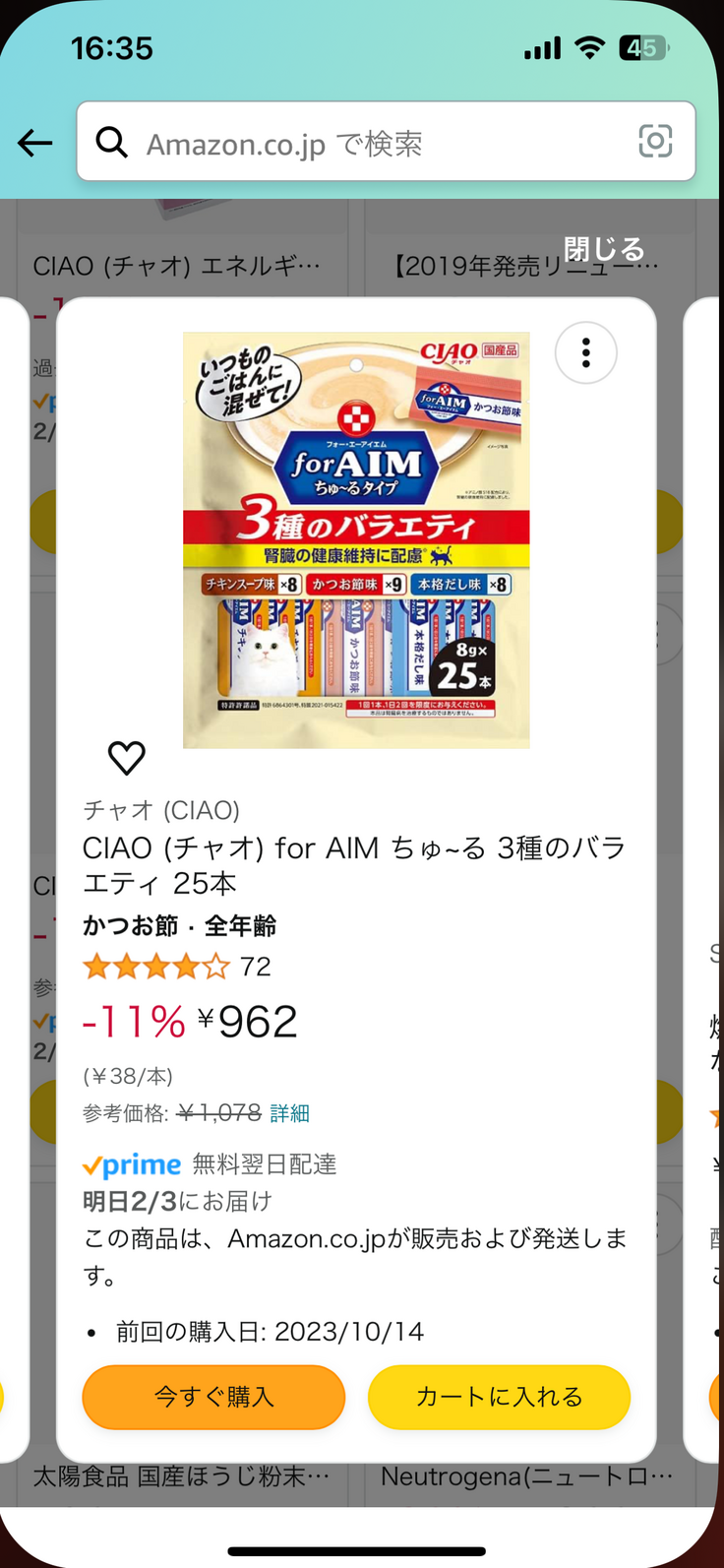 食欲皆無時に直接与えたり、カロリー増しご飯に混ぜてたり、点滴後のご褒美に使っています。
