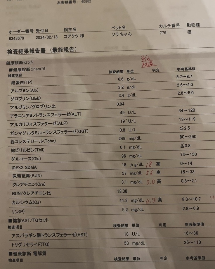 腎臓の数値がこれ以上改善できないとしたら、ソラの腎臓の機能の最大限がこれなのかもしれません。