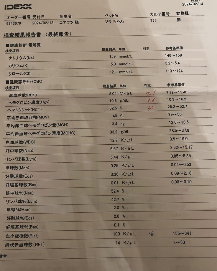 血球数がやはり減ってきているが、ヘマトクリット値が30以上あることと、血球数がギリギリ基準値ということで、エリスロポリエチレンの注射はしなくてよく、様子見となりました。