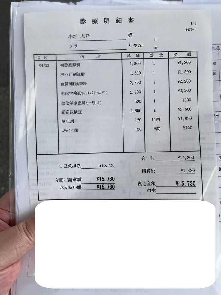 週末は結局ちゅーるを数本/日食べるぐらいで、元気もあまり無くなってきたため、週明け月曜日(4/22)に再度かかりつけの先生に電話したところ、ゴールデンウィーク中に何かあった時のことも考え、年中無休で設備の整った信頼できる先生のところを紹介頂き、タクシーにて向かいました。