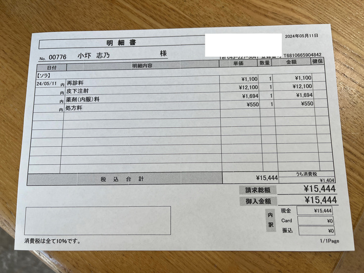 保険適応の通院回数が20回が最大で7月に新しい保険証がくるまで後2回の為、今回は保険は使わずにお会計しました。