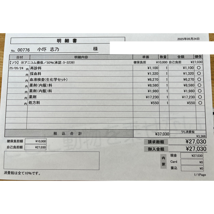 今回の医療費:27,030円(ペット保険適用済金額です)