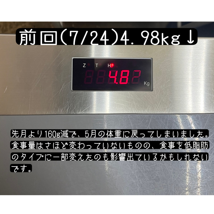 食欲も変わらないので、考えられる要因として他の子が肥満だったり、消化不良で吐くことが増えた為、一部フードを消化器サポートに変えました。