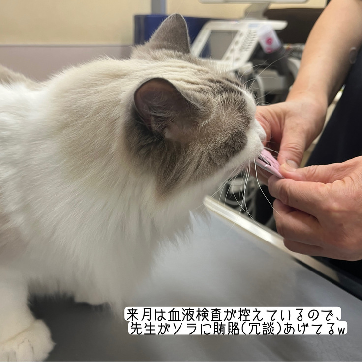 とりあえず今回も様子見となり、来月は4ヶ月ぶりに血液検査が控えているので、お気に入りの鮭味のトイーツを先生から貰っていました。(毎回ご褒美貰ってますw)
