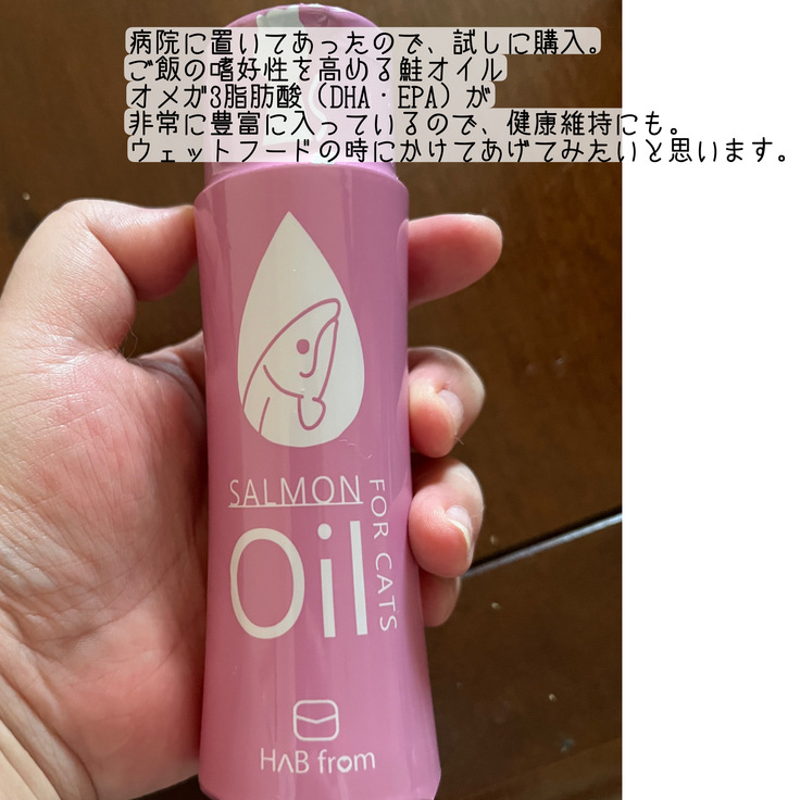 病院に鮭オイルが新たに置かれていて、嗜好性を高める+オメガ3脂肪酸(DHA・EPA)が非常に豊富でいつものご飯に数滴垂らす、クリルオイルのお手軽版なサプリを購入しました。