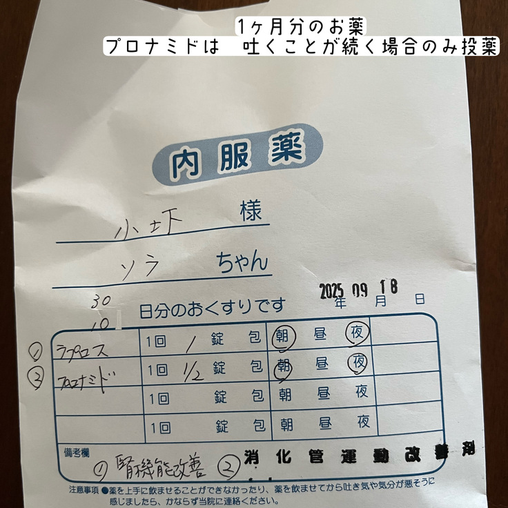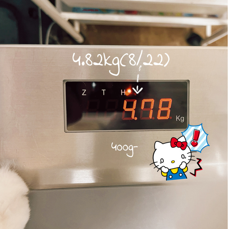 体重は、先月(8/22)4.82kg→4.78kgと40g減と2ヶ月連続で減ってきており、私自身どうしたらいいか?と悩んでいますが、先生的にはこれ以上減らなければ大丈夫だろうと。