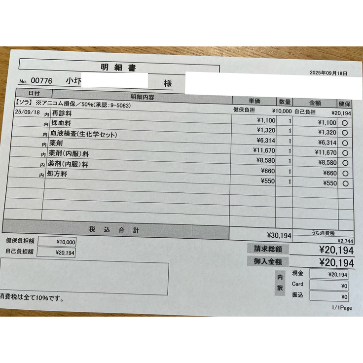 昨日(9/18)のソラの医療費